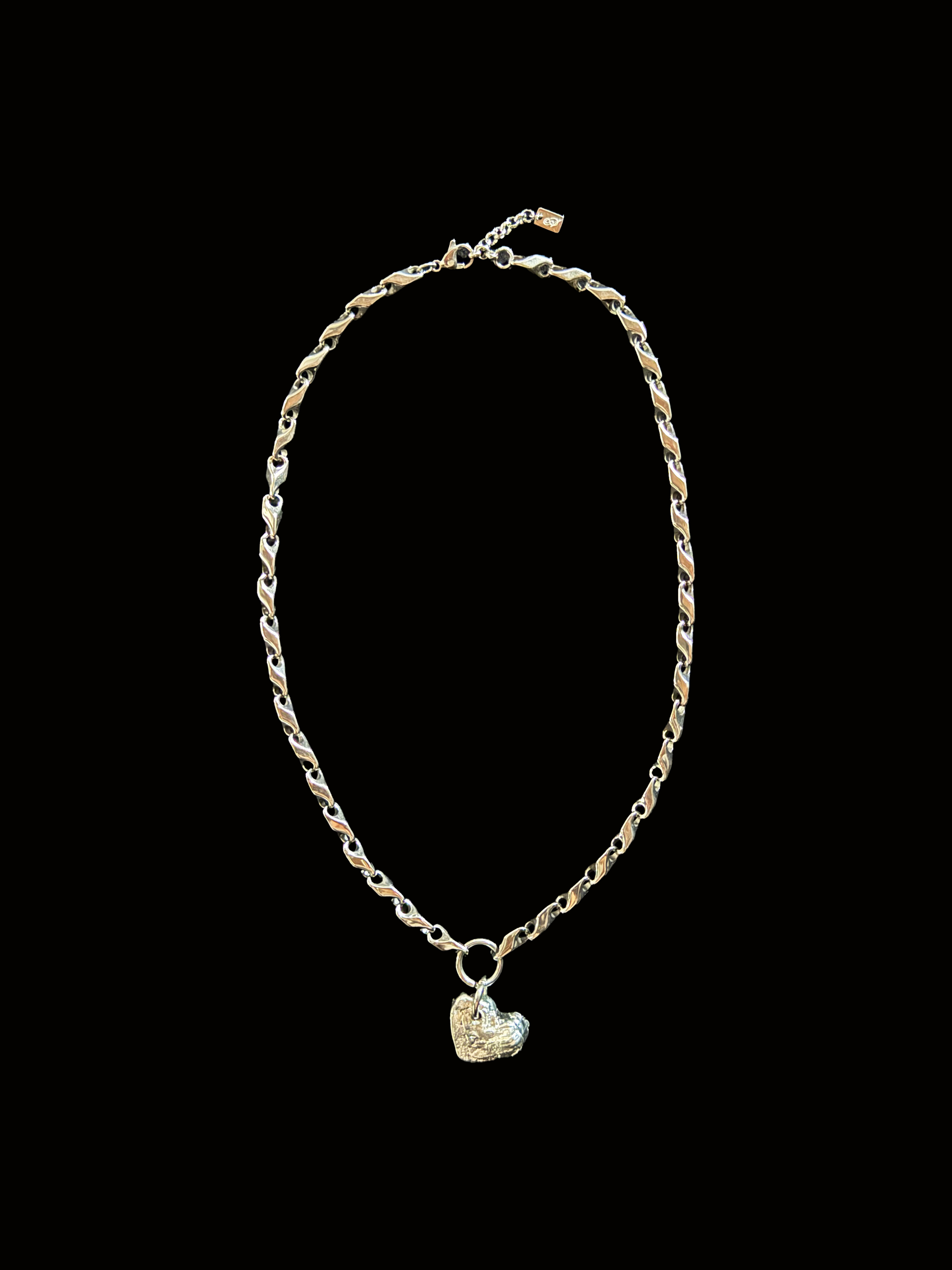 A bold, sculptural necklace where industrial meets elegance. Featuring a chunky stainless steel chain with a pendant crafted from recycled, melted tin in the form of a heart. Handmade and one-of-a-kind, this sustainable piece brings a raw, edgy statement to any look.