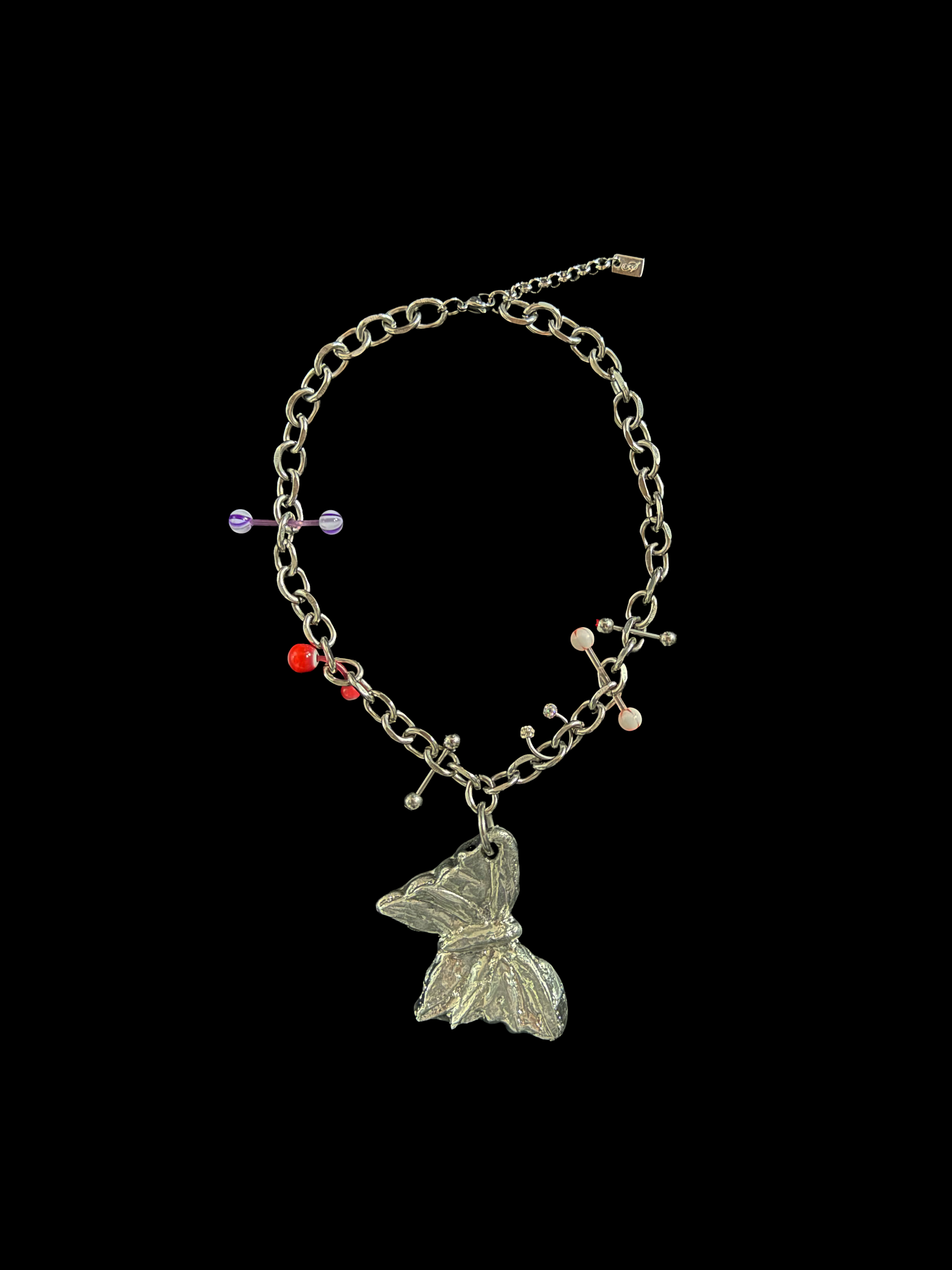 A striking statement choker by weARCHIVE with a sculptural butterfly pendant, cast from melted recycled tin, as centrepiece. Paired with a stainless steel chain and accented with piercings, the necklace carries both toughness and romance.